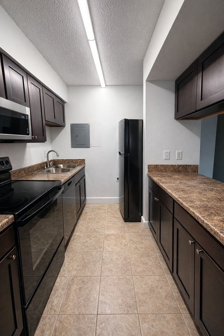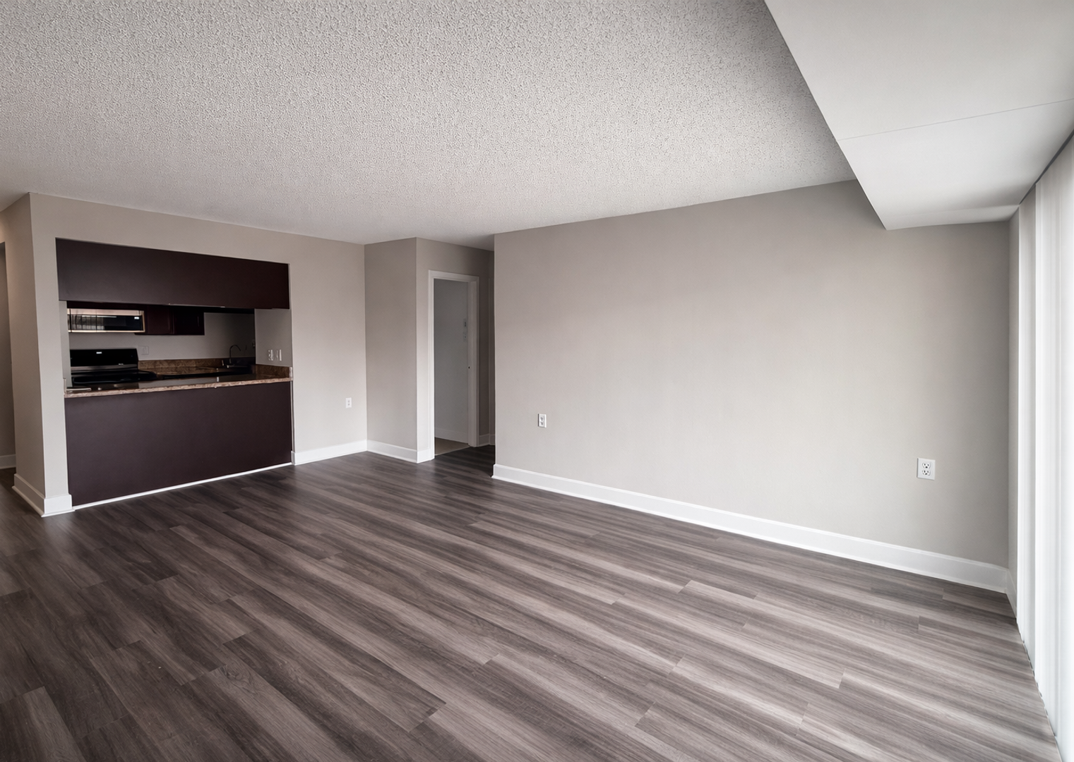 Open floor plan with granite-like breakfast bar overlooking the living room. Kitchen includes black appliances, dishwasher, built-in microwave, ceramic back splash tile and espresso cabinetry. Modern flooring and Spacious balcony with a direct view of the Richmond City skyline.