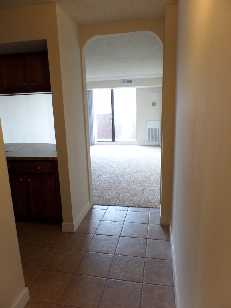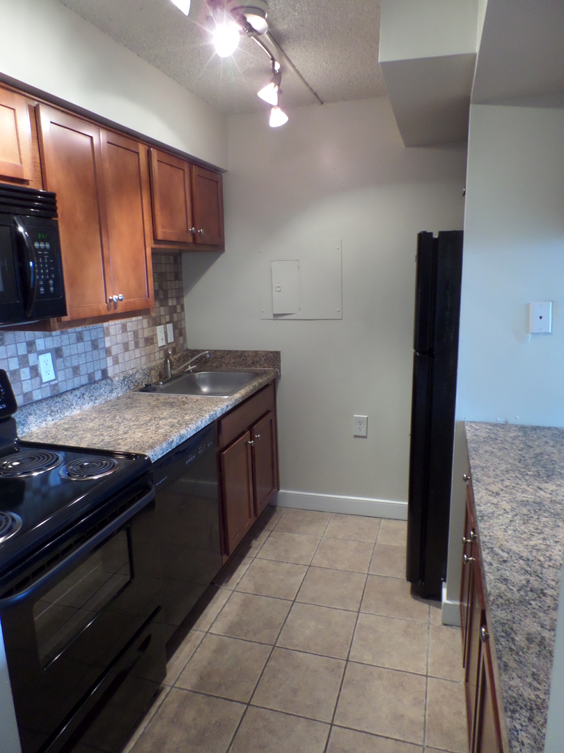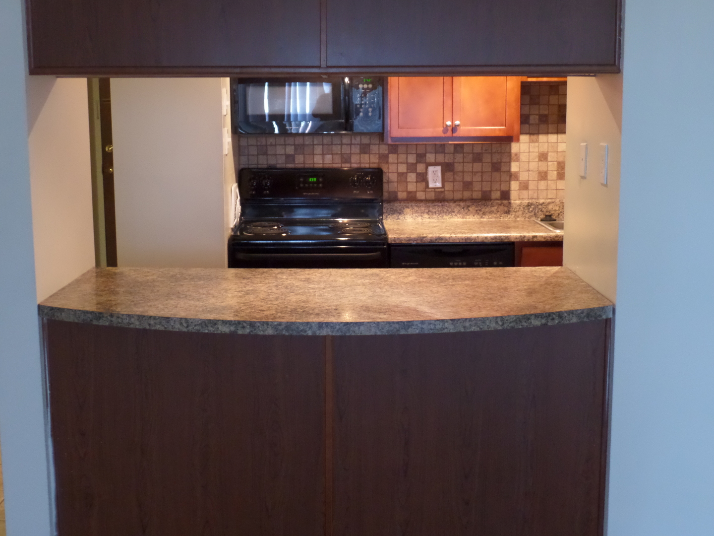 Open floor plan with granite-like breakfast bar overlooking the living room. Kitchen includes black appliances, dishwasher, built-in microwave, ceramic tile backsplash and mahogany cabinetry. Arched doorways and spacious balcony with a direct view of Monroe Park.